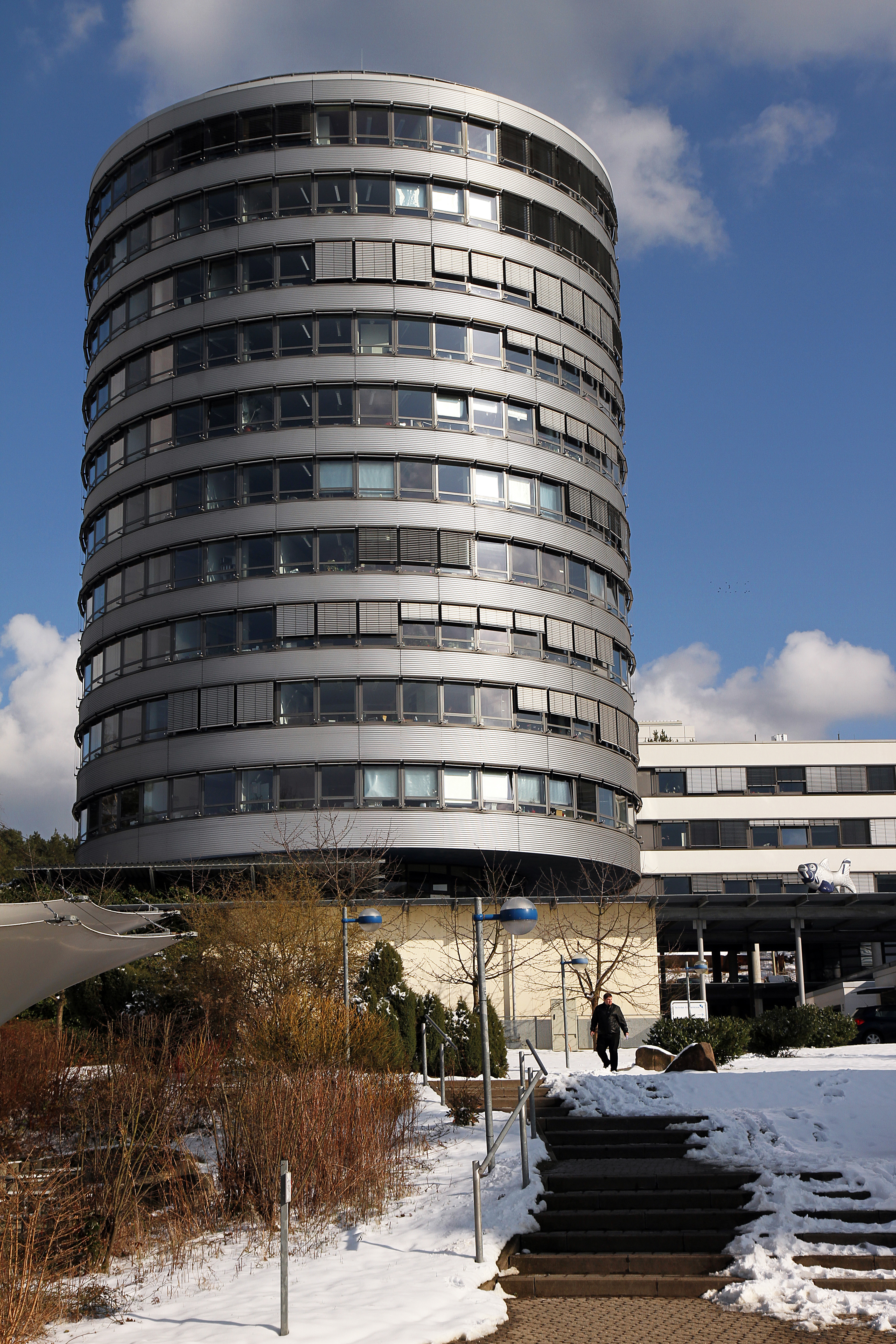 | 47, Verwaltung, Turm, Winter, Weg, blauer Himmel |