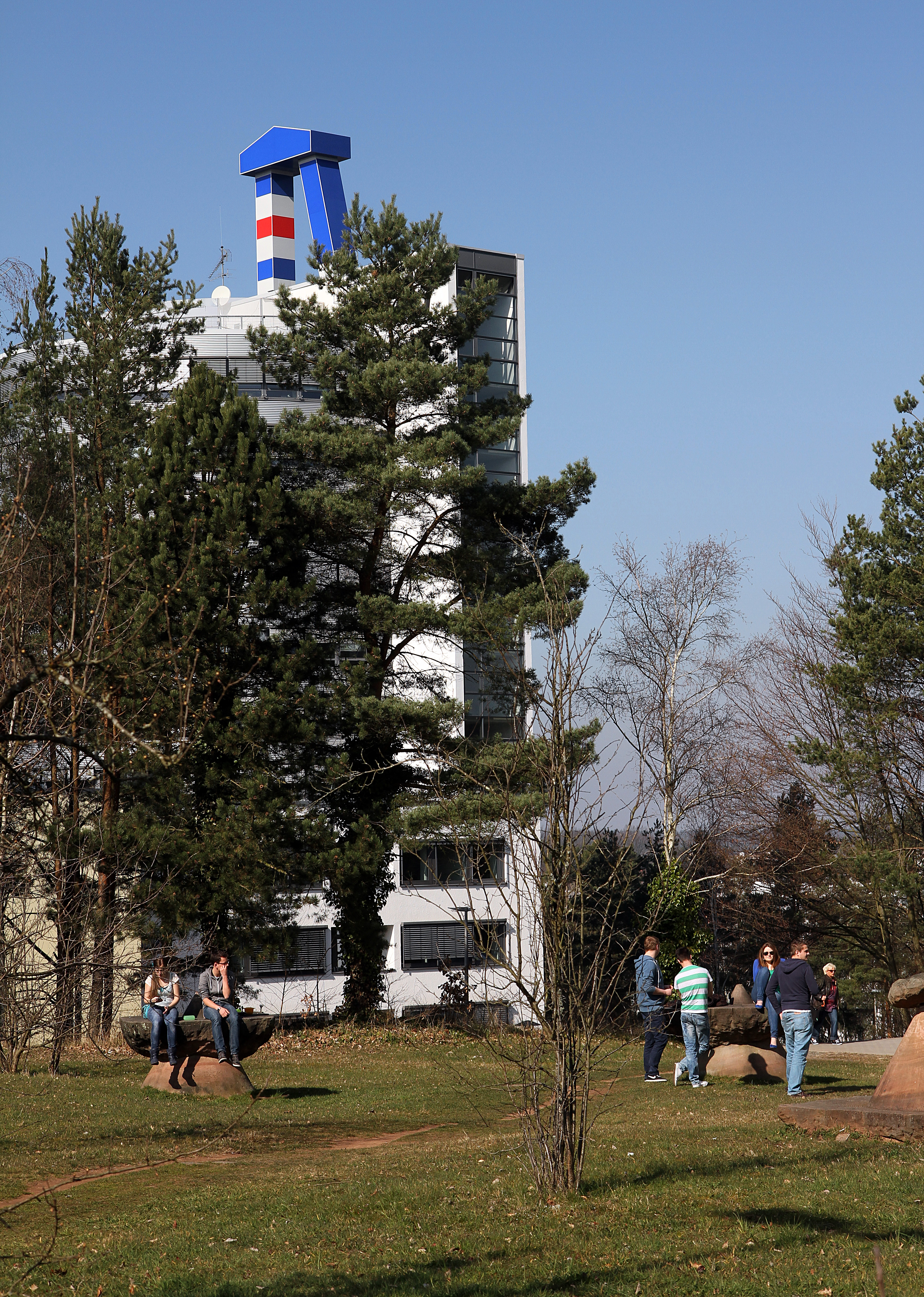 | Wiese, Stimmung, Menschen, Studierende, Pause, Kunst, 47, Turm, Verwaltung, Logo, blauer Himmel |