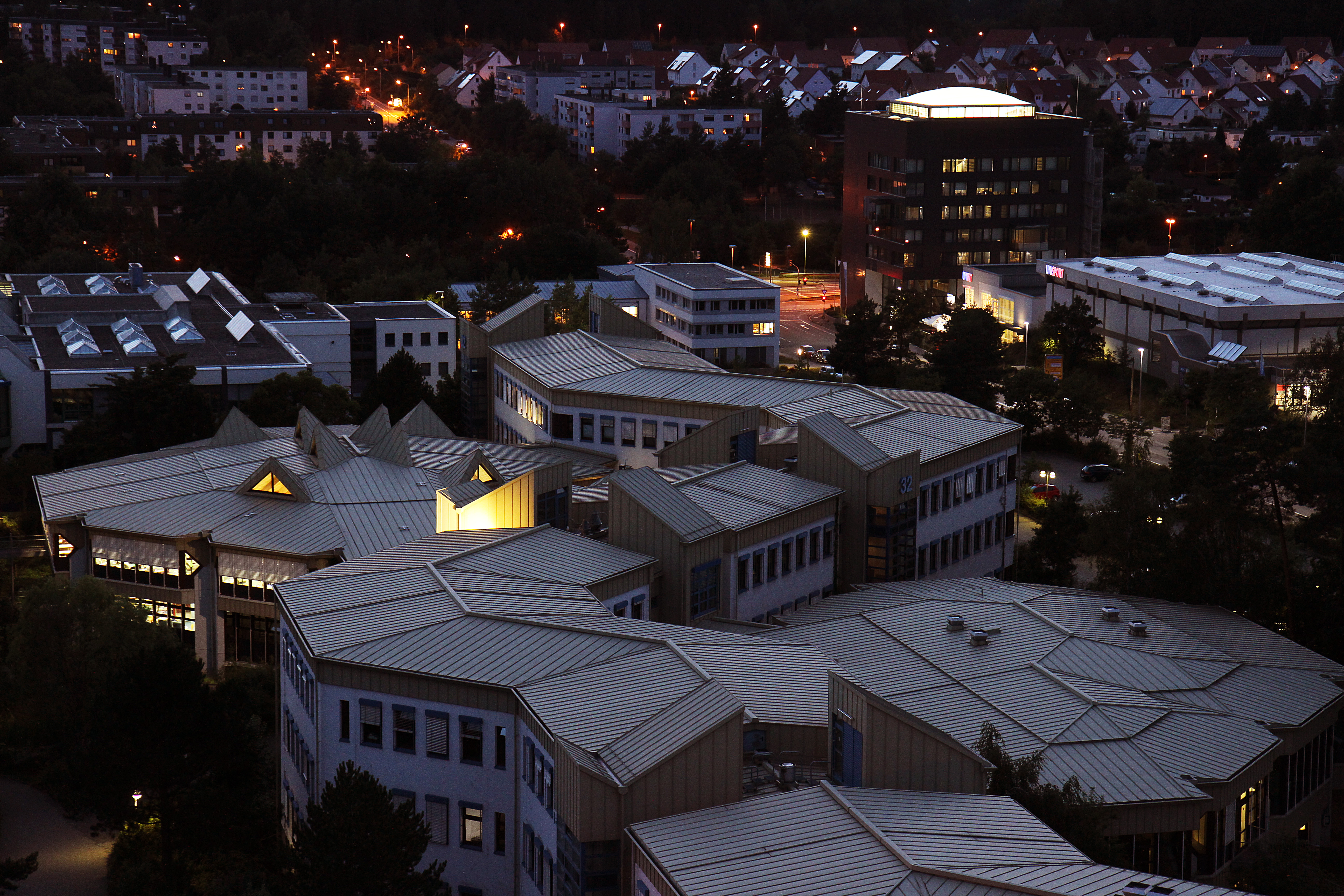 | Mit Blick auf Teile des Rechenzentrums, Zentralbibliothek, Mensa, IBZ, Felix-Klein-Zentrum, Unisport und MPI.