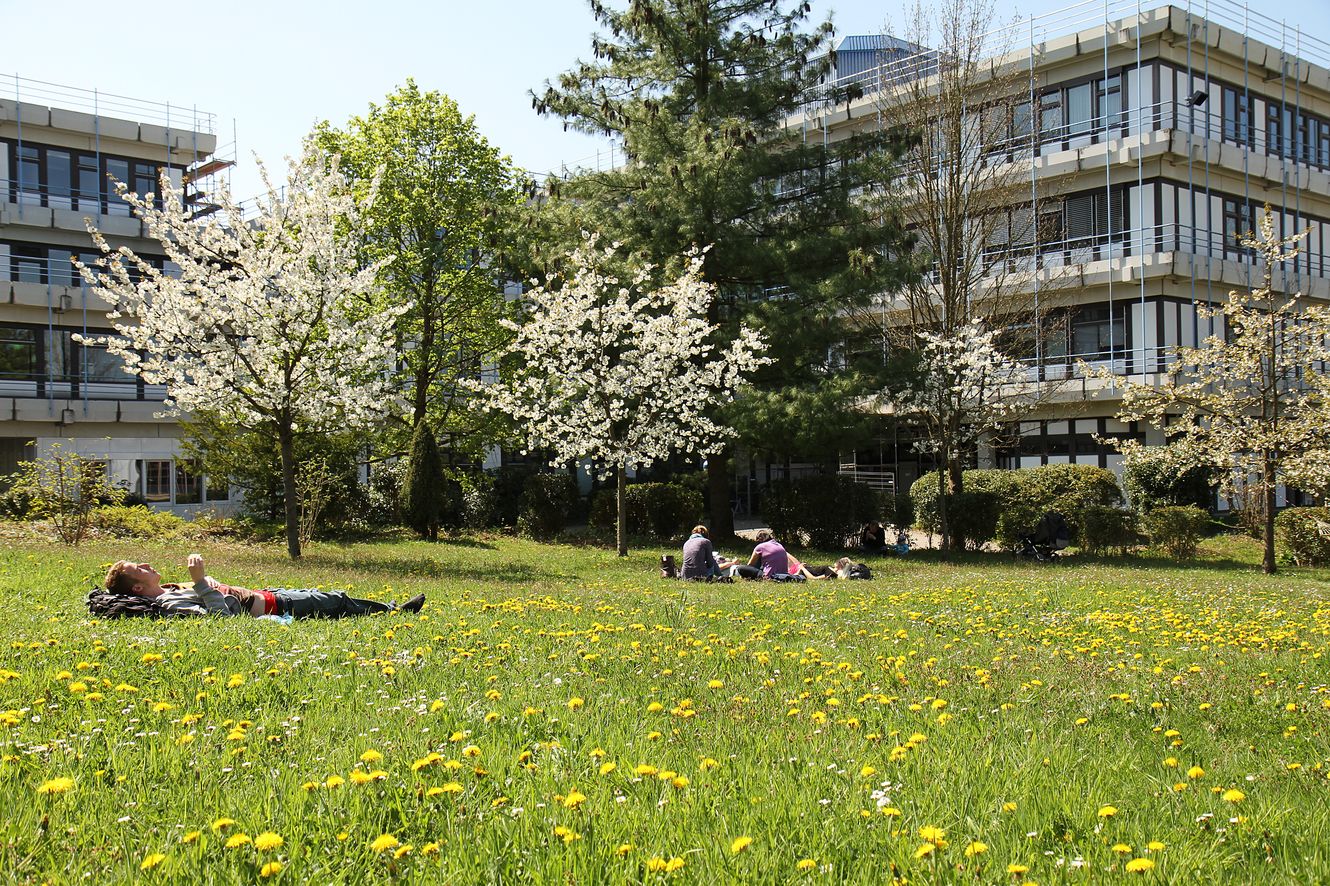 | Frühling, Personen, Studierende, Sonne, blauer Himmel, im Grünen, Campusleben |