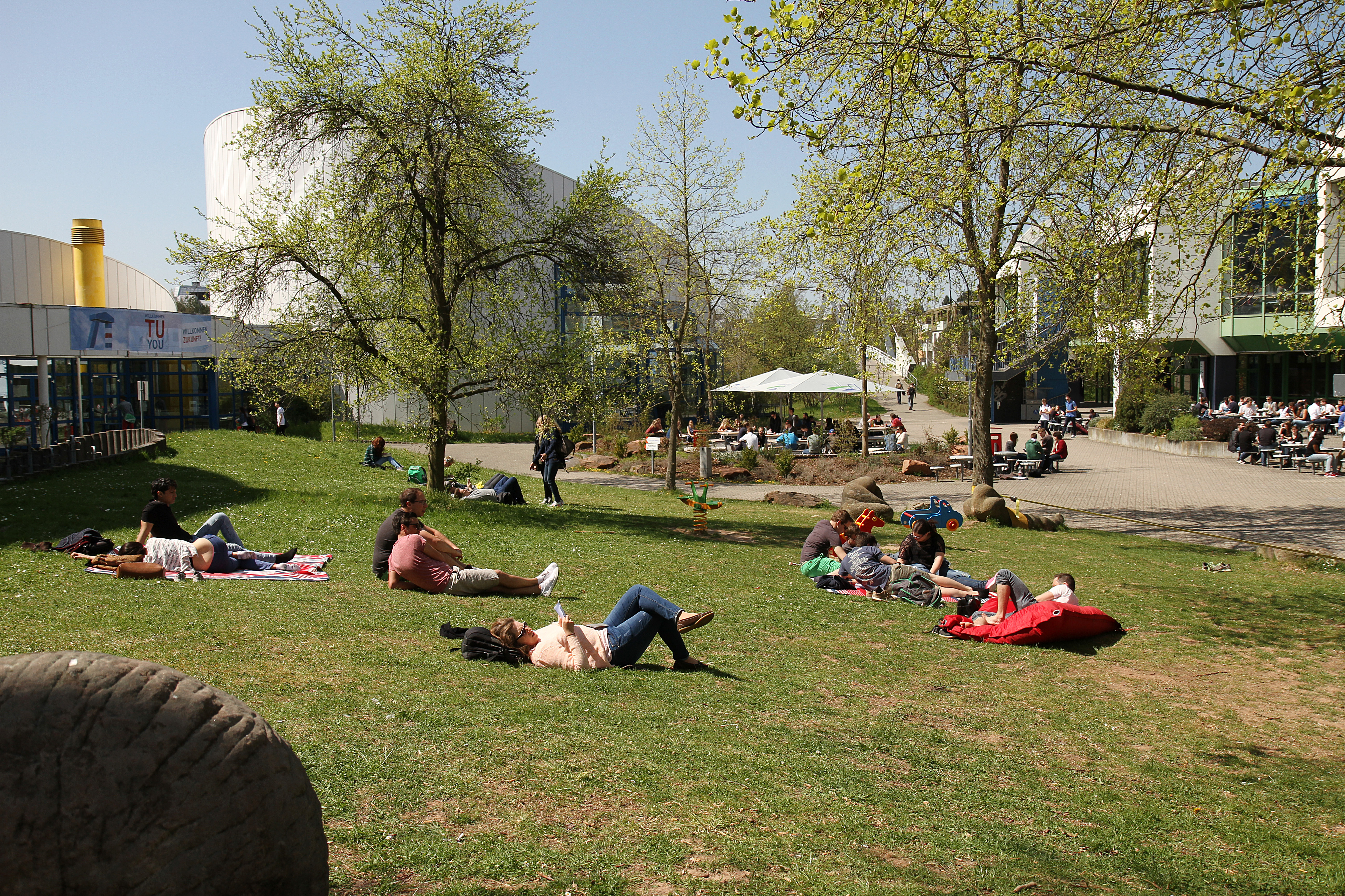 | Frühling, Personen, Studierende, Sonne, blauer Himmel, im Grünen, Campusleben |