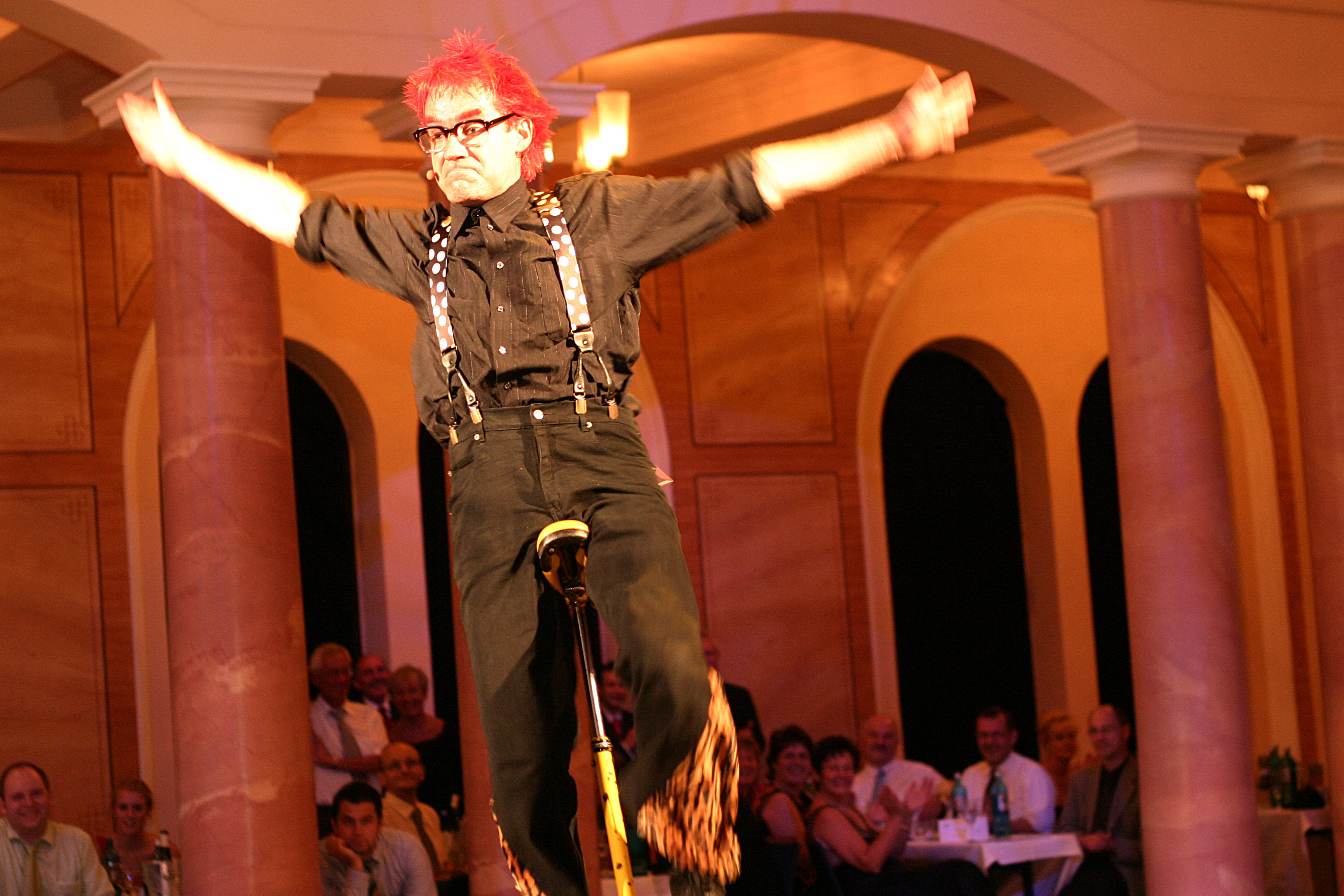 Christoph Engels von der Zirkusfabrik Berlin unternimmt auf dem Hochrad einen Abstecher durch die engen Tischreihen der Fruchthalle.