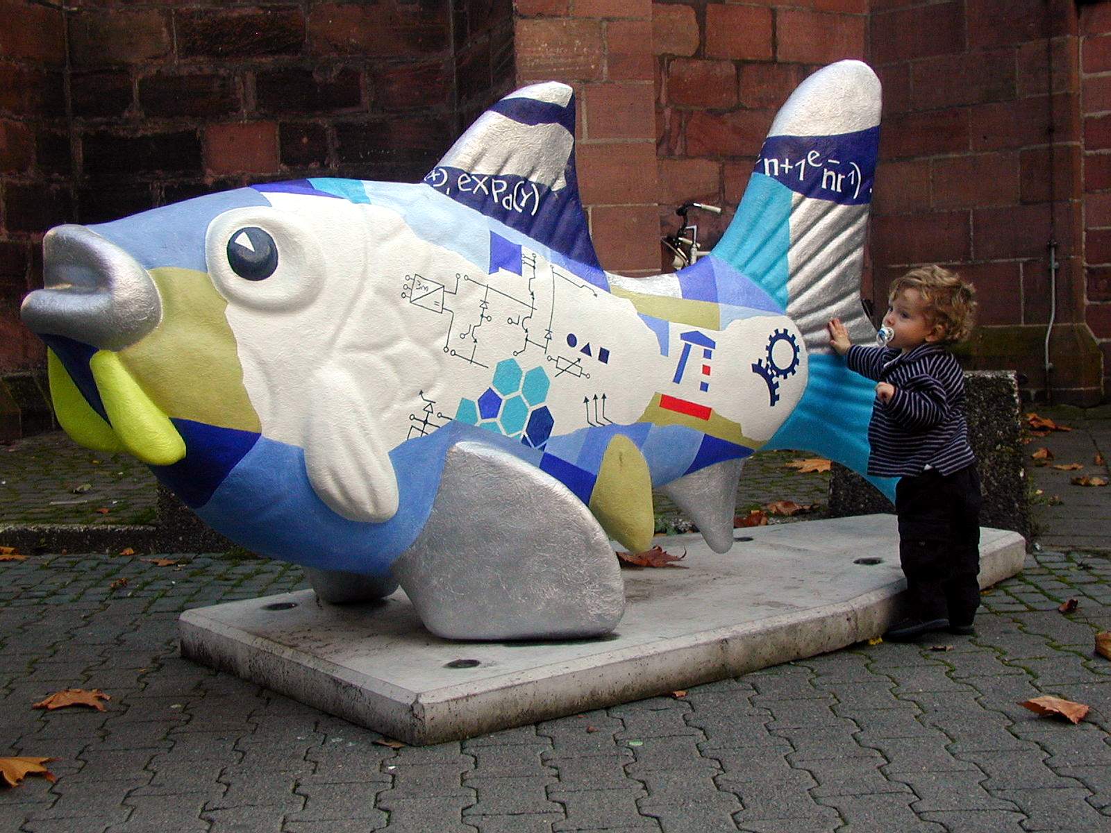 Der Uni-Fisch steht neben der Stiftskirche und wurde von Karl Seiters in loser Anlehnung an die Uni-Farben gestaltet. Aus der Nähe offenbaren sich Fragmente aus allen Fachbereichen. Ein Blickfang nicht nur für Erwachsene! Kunst, Skulptur, Fisch