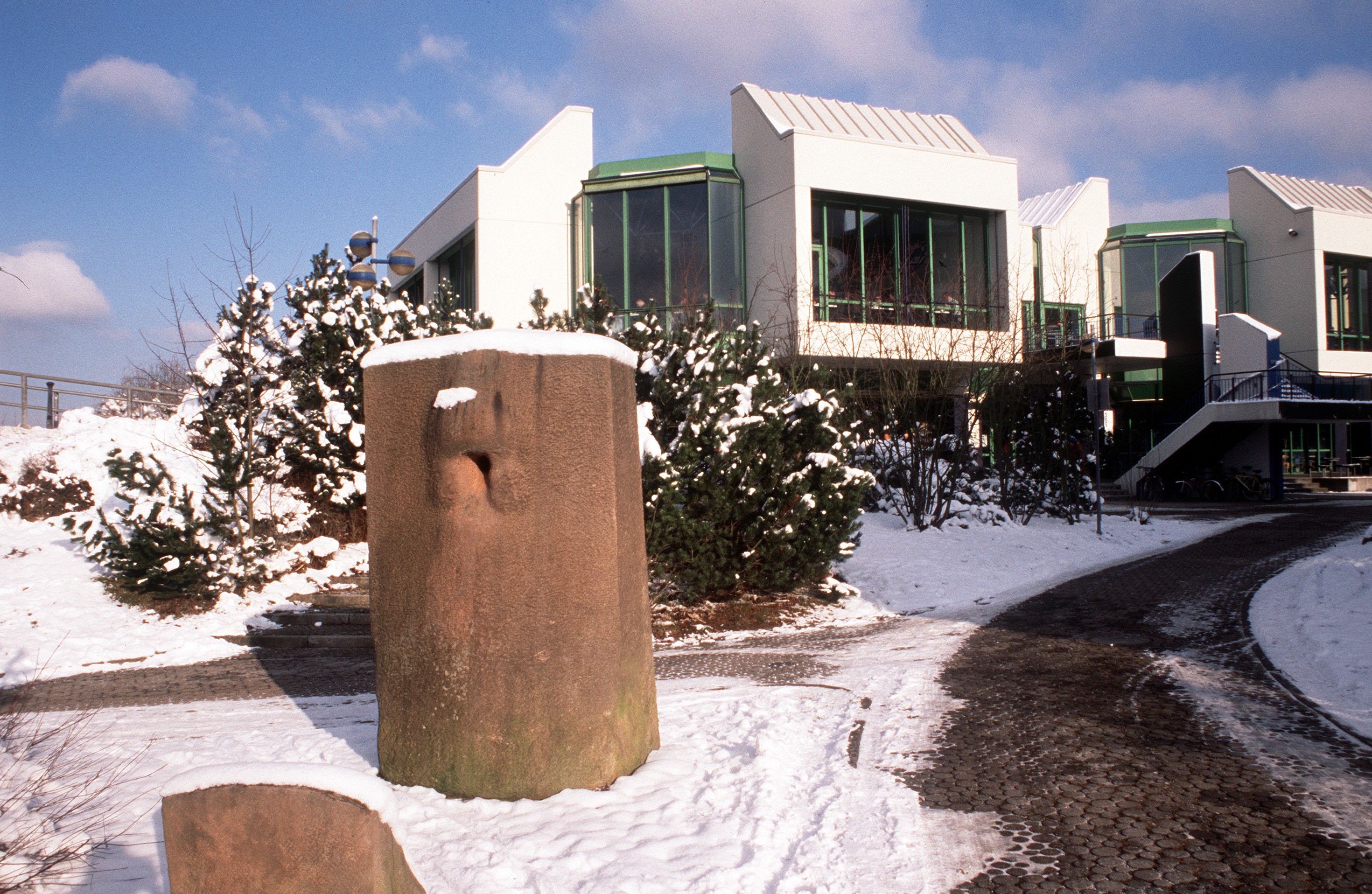 Mensa und Kusnstobjekt im Schnee. Mensa, Kunst, Skulptur, Schnee, Winter